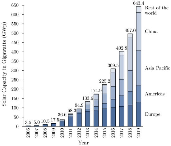 Growth of global photovoltaic capacity has been exponential over the last two decades, from 0.3 GW in 2000 to 63.5 GW in 2019, roughly doubling every 18 months [2,3].