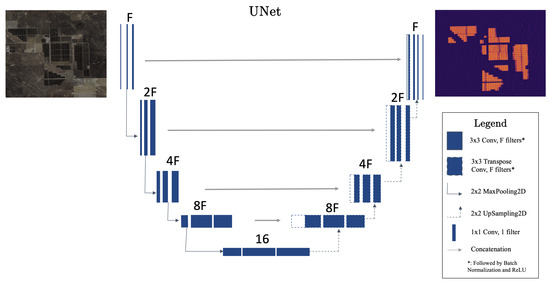 For this research, a deep learning model was developed using the open-source PyTorch library running in Python 3.7. We chose a UNet architecture with F = 64, which gives us a model with 1,940,000 trainable parameters—F was initially chosen based on the literature, and the parameters were finetuned until the best metrics were achieved. All FCN architectures explored were common in their utilization of normalized CMYK satellite images as input.
