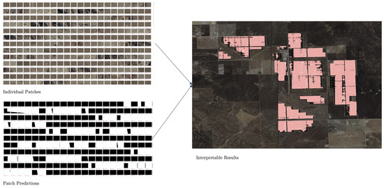 Postprocessing—hundreds of individual images were stitched together to visualize detected solar farm areas.