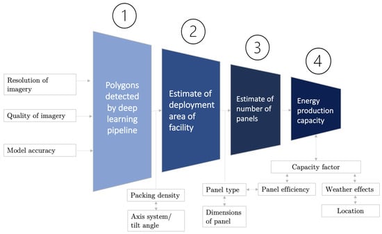 The capacity evaluation model proposed in this section is a compound model of three independent steps—the accurate estimation of deployment area, the estimate of the number of panels, and finally, the evaluation of the energy production capacity of the facility. As depicted in Figure 6, the polygons detected via a deep learning pipeline are used to estimate the “convex hull” area of the facility. Next, the area estimate is distilled down to an estimate of panel area, and consequently, the number of panels. Finally, the energy production capacity is evaluated using a standard formula that includes efficiency, location (weather effects), and/or capacity factor. The area estimate hinges on model accuracy and quality of imagery; the estimate of the number of panels depends on panel dimensions, packing density, and axis system type. Finally, the energy production number depends on capacity factor, which in turn is governed by location, weather effects, panel efficiency, and so on.