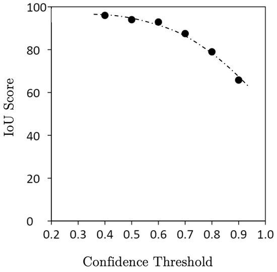 The IoU threshold is the confidence value at which a pixel is considered to be classified as containing photovoltaics. In standard practice, >0.5 confidence is considered as a positive prediction. A classification threshold is analogous to saying that there are higher/lower standards for accepting a pixel as yes/no. Seen in Figure 9 is the variation of the IoU score with the IoU threshold. As expected, there is a decline as the cutoff is made tighter. This can be interpreted in two ways. One, that the model is confident in its predictions, as IoU score only drops fast as the cutoff approaches 1. The best IoU score, 95.5%, was achieved with a cutoff at 0.4, which means the model is balanced but slightly more confident of negative predictions.