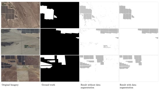 It can be qualitatively observed from Figure 10 that the augmentation techniques play a positive role in precise detection. As seen in Figure 10, the model detections are noisy before training the model on the augmented images. The results after applying the augmentation techniques (elucidated in the Methodology section) show that augmentation not only reduced the amount of noise, but was able to progressively help the model learn the essence of a solar farm.