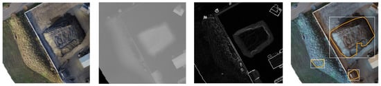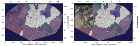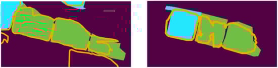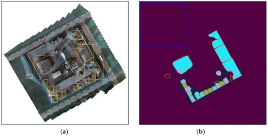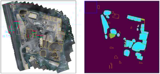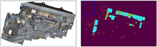 Semantic segmentation of orthomosaics via deep learning was used by Jiang et al. [] to detect piles of demolition debris (see Figure 3). The segmentation component itself assigns a binary label to each pixel in the orthomosaics to denote whether the pixel is part of demolition debris or not. The approach is reported to be relatively accurate with an Intersection-over-Union (IoU) score of 0.9. Consecutive/adjacent pixels that belong to the category “debris” are grouped together. Therefore, the method can identify individual heaps/agglomerations of debris if there is a large enough spatial distance between the areas that are occluded with debris.