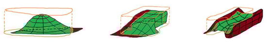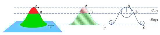 Yang et al. [] proposed a method that extracts individual instances of stockpiles from 3D point cloud data based on Multi-Scale Directional Curvature (see Figure 4). The study is conducted in the context of coal stockpiles in mines, ports, and powerplants. The proposed algorithm extracts stockpiles by (1) identifying individual crests and (2) using a competitive growing strategy to locate the points that belong to the slope regions of the individual stockpiles. The average IoU score regarding the stockpile extraction is reported to be 93.5%, and the average precision of volume is 93.7%. While the method appears to be quite promising for areas where regular-shaped stockpiles stand free on a relatively even ground, it stands to reason that the method may perform less well in “less predictable” environments, where other objects or even parts of the ground also display a “heap-like” shape.