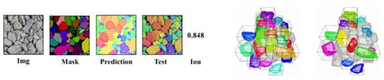 A study that aims to automatically compute the gradation of rockfill material based on instance segmentation was presented by Fan et al. []. The proposed method segments individual grains (see Figure 5), and then computes the gradation based on the dimensions of those grains. The reported Average Prediction (AP) score was 0.934 and the IoU value was 0.879. They reported that the particle gradation detected by their proposed method had a good overall fitting effect with the actual gradation parameters.