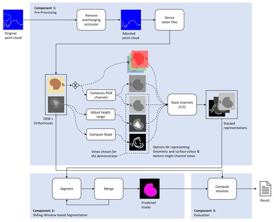 The stockpile segmentation approach proposed in this paper can be described as a pipeline of three components. The first component handles the necessary pre-processing steps. The first step of this component is to convert the 3D point cloud into a 2.5D raster format, creating the equivalent of a DEM and an Orthomosaic. This step is followed by optional feature transformation steps that compress information or highlight presumably valuable features. The final pre-processing step combines the resulting single channel views into a multi-channel input array. The second component performs the actual instance segmentation step using a sliding window-based approach. The third and final component computes the volumes per segmented stockpile based on the instance masks and the DEM.