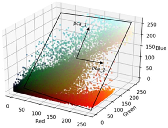 A simple method to compress all three channels into a single one is to compute a greyscale view as a weighted sum for each pixel over all three channels []. This method was chosen for the prototypical baseline implementation, which was used as a demonstrator in this study. An alternative approach is to convert the whole RGB image array into another color-space, e.g., Hue-Saturation-Value (HSV) [], and then select one or two of the new channels to represent the color information. A third option is to utilize dimensionality reduction methods like Principal Component Analysis (PCA) [] (p. 213–220) to project the information from a 3-dimensional color-space onto a lower-dimensional space, e.g., a 2-dimensional plane while minimizing information loss (see illustration in Figure 8).