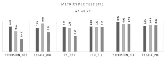 On average, the precision is lower than the recall (compare Figure 15). On test site A and B, most of the false positives come from relatively small objects close to the edge of the respective sliding window position. It stands to reason that this is because at the outer regions of the sliding window, there is relatively little context for any given pixel, compared to regions in the middle of the window. It is unknown how parts of potential objects in this region continue outside the current frame, which makes it more likely to misinterpret objects in those regions.
