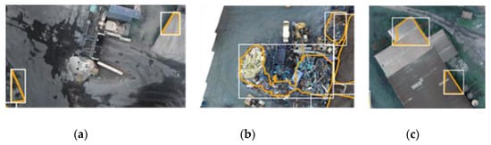 Frequent types of false positives. (a) small predictions at the outer region of the sliding window; (b) piles of crushed metal from a neighboring scrapyard; (c) edges of roofs.