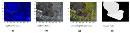 To calculate the volumes of individual bulk material heaps based on digital surface models, the heaps must first be identified and isolated from the rest of the surface to allow for the computation of the enclosed volume. Tucci et al. [] described in detail how this can be done manually using GIS and Point Cloud Processing software. The process includes two essential manual steps: (1) the removal of points that belong to “overhanging” objects like trees or cranes and (2) the segmentation of the individual stockpiles from the rest of the digital surface model by means of manually drawing polygons that mark the outlines of individual stockpiles. The necessity of those manual annotation steps so far stands in the way of a complete automation of bulk material inventories based on remote sensing data.