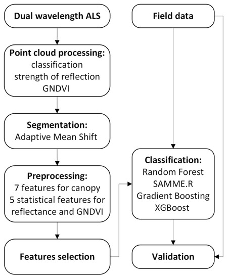 - Pilarska, M.; Ostrowski, W. Evaluating the possibility of tree species classification with dual-wavelength als data. Int. Arch. Photogramm. Remote Sens. Spat. Inf. Sci. 2019, XLII-2-W13, 1097–1103. [Google Scholar] [CrossRef]