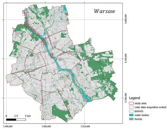 In this study, we used the ALS (Airborne Laser Scanner) of RIEGLVQ-1560i-DW, which uses two laser beams: green and infrared. The green laser beam is highly effective in penetrating a column of water, contrary to the infrared beam absorbed by the water surface [33]. It effectively maps vegetation and waterbody shoreline, where echo sounder limitation is significant [34]. The data were obtained on 7 August 2018, for the Vistula River Valley in the northern part of Warsaw (Figure 2). As was already mentioned, the main characteristic of this scanner is its two spectral channel capability, recording data in the green (532 nm) and the near-infrared (1064 nm) wavelengths. The measurement density for both channels is 6 points/m2. The data were classified using the convolutional neural network model developed at OPEGIEKA Sp.z.o.o. [35]. The height of points above the ground was also calculated, allowing us to determine the tree’s height. Reflectance was calculated as a ratio of the actual amplitude of that target to the amplitude of a white flat target at the same range, oriented orthonormal to the beam axis, and with a size in excess of the laser footprint, according to the formula presented below: