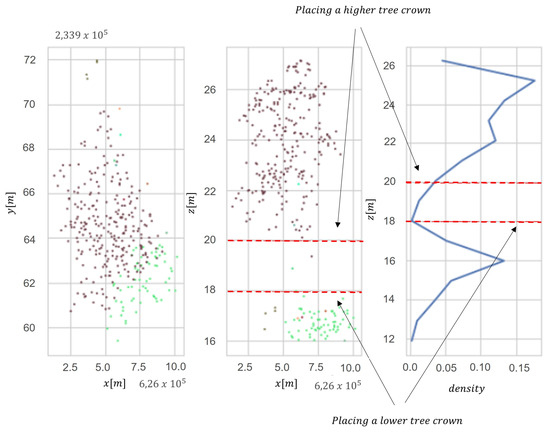 In order to distinguish individual trees, we used the Adaptive Mean Shift model. The adaptability of the algorithm consists of adjusting hyper-parameters to the nature of the data. The better segmentation results were obtained using adaptive seed points instead of bandwidth (h). Mean Shift is a nonparametric segmentation technique that does not require information about the expected number of segments. This method uses differentiation in the density of the point cloud to separate different clusters (segments of trees). The segmentation process consists of two stages—the first is to detect trees in a single-layer structure, and the second is to detect trees in the lower layers of forest stands. The second step applies the vertical analysis of the distribution of previously separated segments. Assuming that a single tree has a vertical bimodal distribution, the algorithm re-clusters segments with a bimodal distribution, placing a seed point at a local density maximum point (Figure 3). The algorithm assumes that the value of the maximum density mode must be greater than 10% of all segment points. The result is tree segmentation of trees located in the lower layers of the stand. The number of histogram bins was obtained with a linear function , where h is the height of a tree and int(x) is a round function of continuous variable .