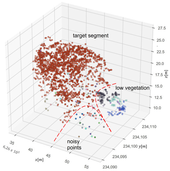 To reduce the vertical division in the first stage of the segmentation, the point cloud was transformed by scaling z value (Figure 4). Before performing the first stage of segmentation, the height of trees is scaled with a 0.8 ratio, and after the first step of segmentation values are rescaled to the previous level. It was empirically established that this solution occurs by not dividing tall trees into smaller parts. After that, segments are refined by an additional algorithm called DBSCAN. This algorithm is used to identify outliers and noisy points. A basic concept is a neighborhood set Nε(p) of a point p, which contains all nearby points q. The range limit ε and a cardinality limit k of Nε(p) are used to divide points into outliers and core points as follows: