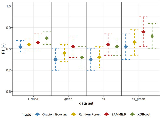 The results of Experiment 1 are shown in Table 2 (all metrics) and Figure 5 (F1-score). All (besides Gradient Boosting using reflectance in the green spectrum) metrics’ mean values are above 0.7 (Table 2). The best results were obtained using reflectance in both the GREEN and NIR spectrum using the SAMME.R algorithm (Table 2, Figure 5). All models based on GNDVI, GREEN, and NIR have a higher (mean value higher than 0.8) F1-score than those using only green or NIR. In most cases (besides GNDVI), SAMME.R has the highest F1-score values on other models’ backgrounds (Figure 5).