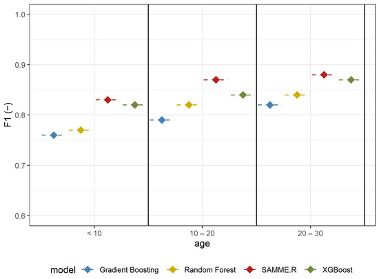 The ability to identify A. negundo in individual age groups was analyzed in Experiment 3. The analyzed models, similar to previous scenarios, were also proven to be efficient in detecting A. negundo trees of certain age classes. The models with the highest efficiency were obtained for the oldest classified trees (F1-score: 0.82–0.88) (Figure 7, Table 4). SAMME.R (Precision: 0.87, Recall: 0.93, F1: 0.88) obtained the highest efficiency for this group (Table 4). Values of recall (from 0.85 to 0.90) for the model tested on middle-aged maples (age from 10 to 20) indicate that the models are not as efficient at detecting middle-aged A. negundo as they are at the old age group (Recall from 0.87–0.93); however, the difference is not significant. The highest value of Recall was obtained in a group of older maples (Recall: 0.93), while in the youngest age group, the sensitivity of A. negundo detection was the lowest (Recall: 0.87) (Table 4). We need to mention that results for the young trees (age < 10) are the same as those in the understory layer because the young group of trees creates an understory layer.