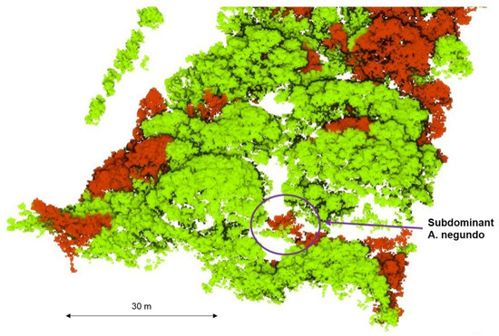 Due to the separate ways of managing invasive plant species, it is crucial to properly visualize the results to make them accessible to a broader scientific audience [39]. Therefore, this study’s 3D model of all species, which highlighted invasive A. negundo in the tree layer (Figure 8) and the understory layer (Figure 9), can be presented.