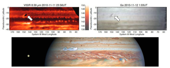 One of the better-documented atmospheric cycles in Jupiter’s atmosphere is the change in the colors of cloud bands. The best known of these is the fading of South Equatorial Belt (SEB) which has been observed five times since the 1970s [26,27]. The SEB faded most recently in 2009–2010. The 2009–2010 event also demonstrated the effectiveness of networked observations of Jupiter. During the fading, the International Outer Planets Watch mobilized amateur observers from around the world, who volunteered to image Jupiter and submit their results to PVOL servers. Even though there were many large gaps in the temporal and longitudinal coverage during this time, the collective efforts by the amateur astronomers revealed a sequence of sub-events during the 2009–2010 SEB fading [27,28]. The revival of the SEB begins as a series of discrete disturbances within cyclonic barges (see Figure 1 adapted from Fletcher et al. [29]).