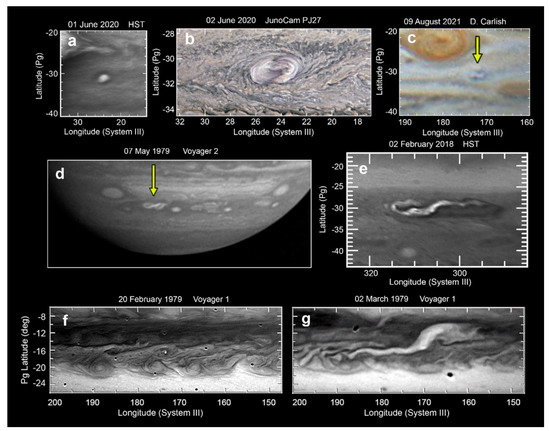 Storm systems which had a cyclonic origin (adapted from [35]). (Panels a–c) correspond to the evolution of Clyde’s spot from an initial outbreak to a cyclonic FFR. (Panels d,e) correspond to the STB Ghost. (Panels f,g) correspond to a storm in the STB observed by Voyager.