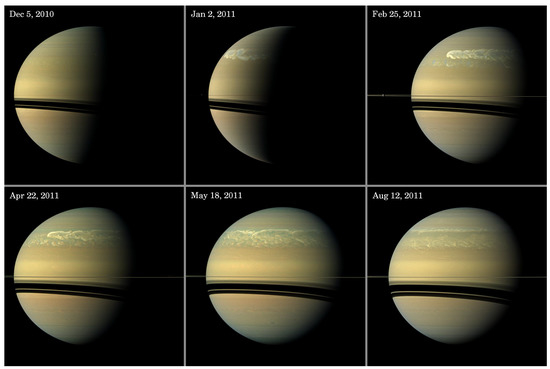 The most intense episode of SEDs was observed during the 2010–2011 Great Storm of Saturn [51]. The 2010–2011 storm is believed to be the latest occurrence of the giant storms that repeat on Saturn approximately every 30 years, previously observed in 1876, 1903, 1933, 1960 and 1990 [52]. From Earth, these storms appear as a spot of particularly bright clouds that last for many months and thus have historically been called the Great White Spots (GWSs). These giant storms last for many months and are the true exceptions on Saturn where thunderstorms are mostly absent. The 1990 storm erupted while the then-new Hubble Space Telescope (HST) was being calibrated, and became HST’s first scientific observation and documented the temporal evolution of the cloud evolution in detail [52,53]; the storm motivated several numerical modeling studies to examine the dynamics of such storms [54,55]. The 2010–2011 storm occurred while Cassini was orbiting Saturn, and allowed detailed observations of the storm’s cloud morphology as well as SED signals to reveal that intense cumulus storms continuously erupted for over 6 months [51,56]. The high spatial resolution observations by HST and Cassini showed that the bright clouds produced by the 1990 and 2010–2011 storms encircled the entire latitude bands of the storm and altered the structure of the atmosphere at that region (Figure 5). Detailed review of the 2010–2011 storm is presented by Sanchez-Lavega et al. [57].