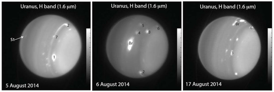 Observations of discrete cloud structures on Uranus in the infrared wavelength from the Keck observatory. ‘Br’ corresponds to the Berg structure, but several other regions show cloud structures (numbered). Adapted from [78].