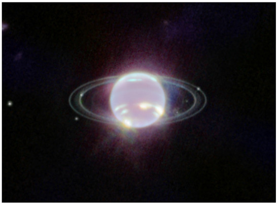 Neptune’s atmosphere continues to be highly active to date including formations of a new dark spot [102], an equatorial storm [103] and other smaller features [104,105,106]. Mid-infrared observations of the planet also reveal that stratospheric temperatures exhibit changes in timescales shorter than a season, which may be driven by cumulus events in the troposphere [107]. One of the first images returned by NASA’s recently launched James Webb Space Telescope captured the clearest view of Neptune since the 1989 Voyager 2 flyby, and promises to bring potential to further understand Neptune’s high atmospheric variability [108] (Figure 8).