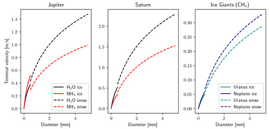 Figure 9. Typical terminal velocity profiles of different species on Solar System gas giant atmospheres. The first two panels show the terminal velocity of water (black) and ammonia (red) ice and snow, on Jupiter and Saturn respectively at a pressure of 5 bars. The third panel shows the terminal velocity of methane ice on Uranus (light blue) and Neptune (dark blue). The solid lines correspond to cloud ice particles, and the dashed lines corresponds to snow. - 3.