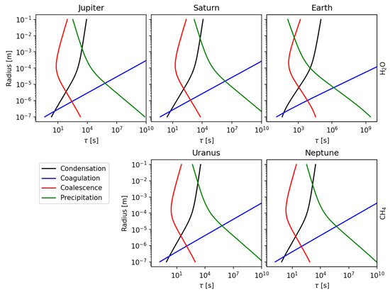 A simple mechanism for understanding the competition between these processes is to look at the typical time taken to create (or dissipate) a particle of a given size [115,116]. Figure 10 shows characteristic timescales for water ice on Jupiter, Saturn and Earth, and methane ice on Uranus and Neptune. Formation processes (condensation, coagulation, coalescence) are initially much faster compared to precipitation for small particles, and thus condensation can quickly grow initiated particles, within a few seconds, to a size of ∼1 m. Beyond this, coalescence helps the particles grow to ∼1 cm through collisional mergers, at which point precipitation timescales become short enough to carry the particles away from the source and inhibit growth. All the examples shown here demonstrate particles large enough to precipitate forming within the timescale of a few hours (), which is comparable to the time scale for thunderstorm formation in the tropics on Earth.