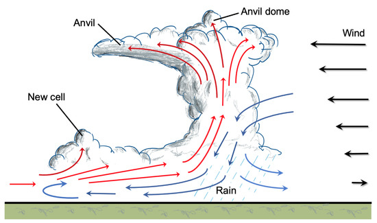 The vertical wind shear of the background atmosphere also has a strong effect on how the convective cells evolve, the shape of the storm and the motion of the air within (Figure 11). Smaller storms may get torn apart by strong vertical wind shear, preventing their growth and limiting their lifetimes, while the growth of larger convective features may benefit from a strong shear [123]. In single cell convective storms, as soon as the precipitation particles become too heavy to be kept aloft by the updraft they begin to fall and initiate the downdraft. The evaporating condensates in the downdraft increase its strength and it spreads out horizontally upon colliding with the surface. The precipitation and the diverging downdraft at the surface are two characteristics of the dissipating stage of the storm.