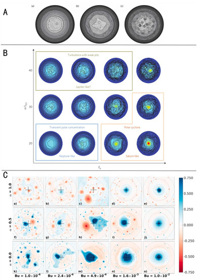 - Brueshaber, S.R.; Sayanagi, K.M.; Dowling, T.E. Dynamical regimes of giant planet polar vortices. Icarus 2019, 323, 46–61. [Google Scholar] [CrossRef]