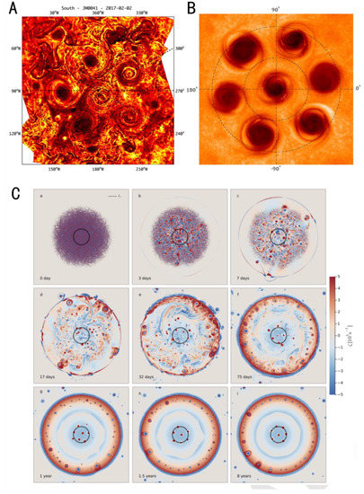- Cai, T.; Chan, K.L.; Mayr, H.G. Deep, Closely Packed, Long-lived Cyclones on Jupiter’s Poles. Planet. Sci. J. 2021, 2, 81. [Google Scholar] [CrossRef]
