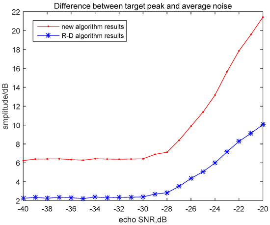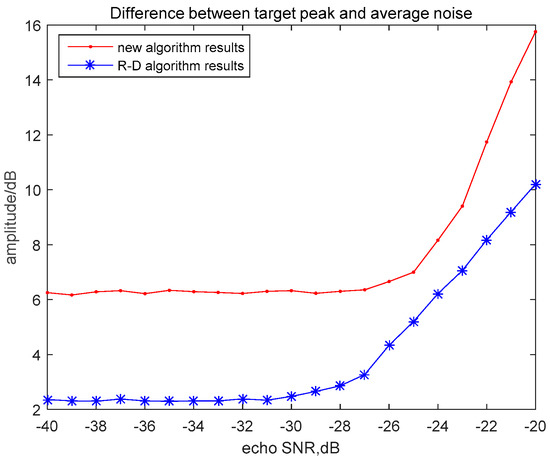 Figure 10 presents the difference comparison curve between the target peak value and the mean noise platform value under different echo SNRs with 0 dB reference channel SNR. The point corresponding to each echo SNR in the figure is the result of 10,000 times Monte Carlo simulations. Compared with Figure 4, the output SNR of the algorithm presented in this paper is also much higher than that of the traditional R-D algorithm. With an increase in the echo SNR, the output SNR also improves.
