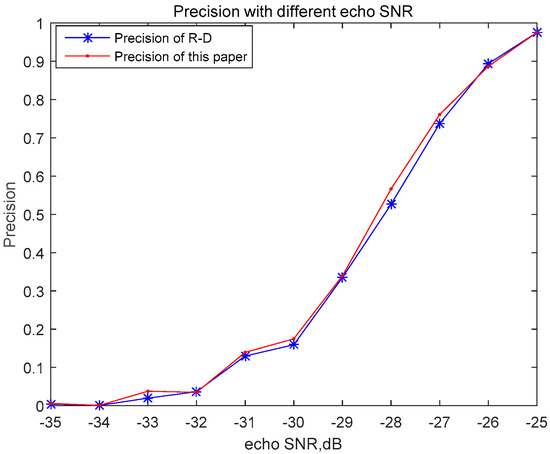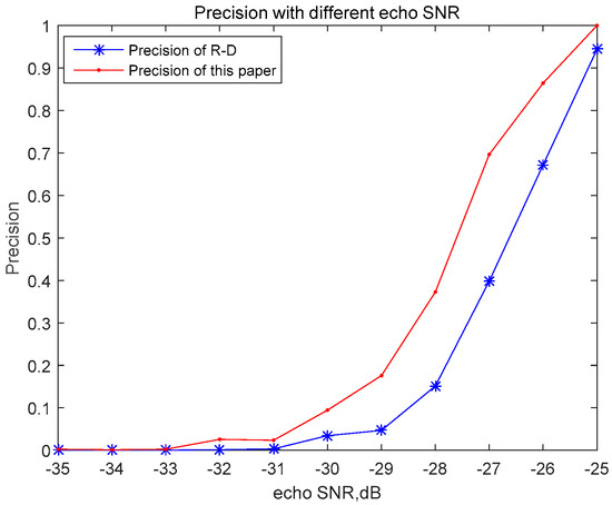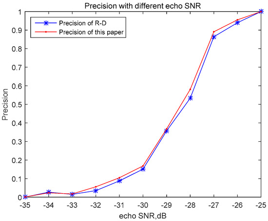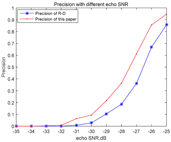 Figure 11 presents the comparison of precision values between the proposed algorithm and the R-D algorithm with a reference SNR of 0 dB. Under the condition that all targets can be detected, the threshold is set to be 0.5dB less than the minimum target peak value. It can be seen from the figure that, similar to the results presented in Figure 5, the accuracy of the algorithm in this paper is higher than that of the traditional R-D algorithm. However, its estimation accuracy is slightly lower than that of the pure reference channel. Compared with Figure 11, the threshold in Figure 12 is set to be 2 dB less than the minimum target peak value. It can be seen from the figure that the precision of the algorithm in this paper is much higher than that of the R-D algorithm.