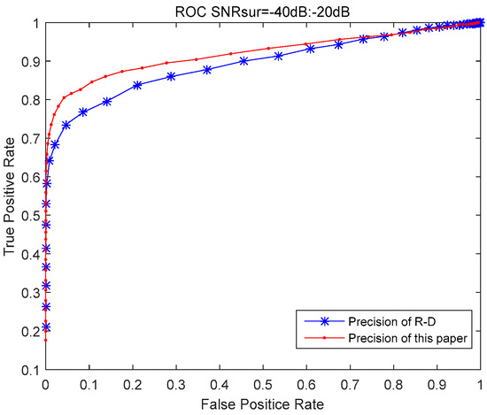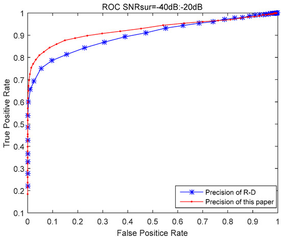 Figure 5 presents a comparison of precision values between the proposed algorithm and the R-D algorithm. The precision is defined as the proportion of the real target samples to all the predicted target samples. Under the condition that all targets can be detected, the threshold is set to be 0.5 dB less than the minimum target peak value. It can be seen from the figure that the precision of the algorithm presented in this paper is slightly higher than that of the traditional R-D algorithm.
