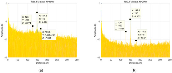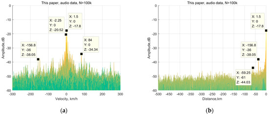 Integration results obtained with the proposed method for the audio signal: N = 105; (a) Doppler dimension; (b) Range dimension.