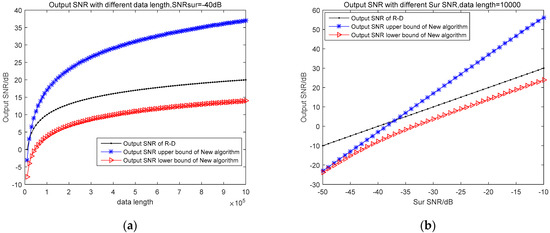 Comparison of the output SNR between the two algorithms: (a) comparison under different signal lengths: SNRsur = −40 dB; (b) comparison under different SNRsur: N = 104.