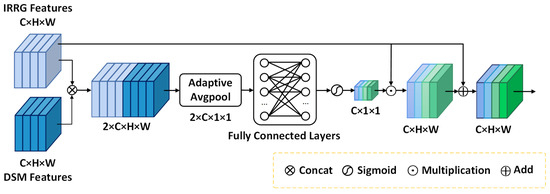 As shown in Figure 3, the SFM module concatenates features extracted from IRRG and DSM images. Then, it utilizes an adaptive global average pooling to extract the global features and acquires weight parameters for each channel of global features by using two fully connected layers to compress into a one-dimensional vector from the global features. Afterward, features with the same size are obtained by multiplying the weight parameters of each channel by the features extracted from IRRG images of the same level. Moreover, the selective fusion features would be obtained by adding features extracted from IRRG images to the previous features.