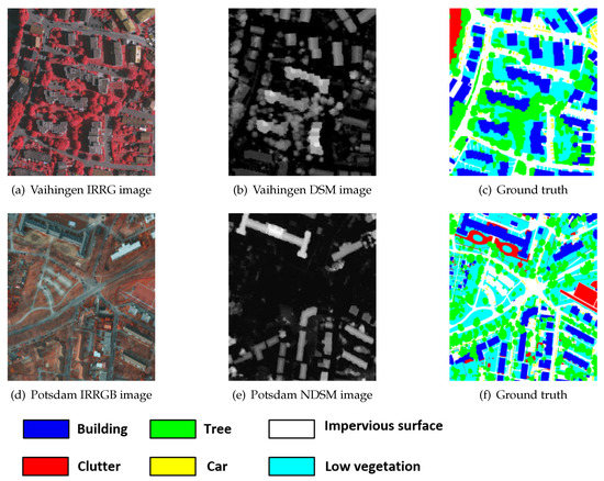 The ISPRS Potsdam dataset contains 4-band infrared/red/green/blue (IRRGB) images, corresponding DSM, and normalized digital surface model (NDSM). There are 38 images of about 6000 × 6000 pixels. To ensure the consistency of the number of channels of the model input data, we will extract 3-band IRRG images from 4-band IRRGB images and NDSM image as the model input. In the experiments, 17 images are used as the training set, 14 images as the test set (IDs 2_13, 2_14, 3_13, 3_14, 4_1, 4_13, 4_14, 5_13, 5_14, 5_15, 6_13, 6_14, 6_15, 7_13), and 4 images as the validation set (IDs 2_11, 4_11, 6_9 and 6_11) in the experiments.