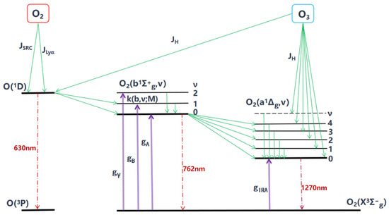 The resonant absorption of solar radiation in the A, B, and γ atmospheric bands (762, 688, and 629 nm) and the infrared atmospheric band (1.27 µm) also contributes significantly to the production of O2(a1∆g). Because the line intensity of the O2 infrared atmospheric band is relatively weak, the photoexcitation-induced contribution from the 1.27 µm band is far from the dominant source of the O2(a1Δg) state, while resonant phosphorescence by the 762 nm band, which produces the O2 () state, makes a relatively large contribution through quenching processes in collisions with all basic atmosphere components, especially for altitudes from 60 to 80 km. The O2 () state interacts with other molecules and is quenched to the O2(a1Δg) state in collisional processes of energy transfer. The resonant excitation processes of the O2 () and O2(a1Δg) states, as well as the energy transfer of the O2 () state can be expressed by the following formulas: