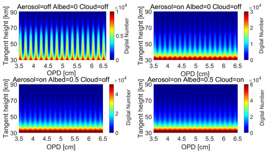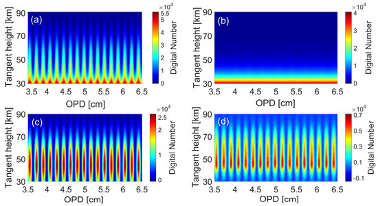 Figure 10b shows the atmospheric scattering signal image, which was obtained by only using the scattered sunlight background as the input for the atmospheric spectral radiance in Equation (2). A comparison between the two images shows that the combined signal is dominated by the atmospheric scattering signal below 40 km, as would be expected for limb-viewing instruments. In an actual observation, each row of the interferogram contains contributions from O2(a1∆g) dayglow emission and the scattered sunlight background, especially for low altitudes. The non-modulated term of the interferogram can be simply removed by using straightforward Fourier techniques [29].