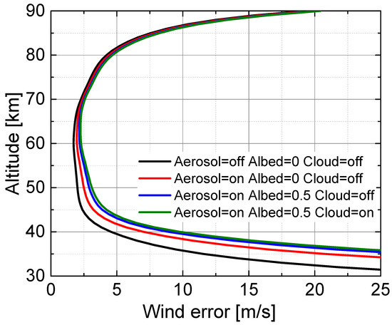 The sensitivity functions for the simulated interferogram images were determined for each OPD (corresponding to points along the horizontal axis of the interferogram image). Retrieval precisions were estimated from the sensitivity functions by combining observations from all OPD values, assuming a constant tangent height along each row. Statistically averaging of the columns of the pixel map provided the resultant wind profiles [31]. The corresponding wind error levels were also obtained at the same time, which are shown in Figure 13. This indicates that the random errors for Doppler wind were in the range of 2–3 m/s for the tangent height range from 45–80 km. The large values of wind error at higher tangent heights were because of the low effective SNR at those heights. The wind precision under 45 km suffered significantly from the scattered sunlight background. For a satellite-borne instrument to provide useful wind information, it needs to measure wind speed of at least a few meters per seconds. If the error level of 10 m/s for wind measurement is acceptable, a lower limit of 35 km in detection altitude can be achieved in the case of pure Rayleigh scattering. For the case of taking the atmospheric aerosol into account, this lower limit of detection altitude increased to 38 km. This value will reach 40 km in cloudy weather. This behavior is due to the fact that the shot noise depends largely on the scattered sunlight background, and the change of the surface albedo, aerosol loading, or cloud will inevitably lead to the variation of the effective SNR, which subsequently affects the wind precision.