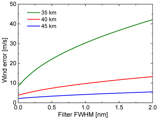 The sensitivity analyses can also be used to evaluate the influence of the variation of the system parameters on the wind measurements. The proper configuration of these parameters must meet the science objective within technology limitations and cost constraints. Here, the sensitivity of wind measurements to the Full-Width at Half-Maximum (FWHM) of the filter was investigated. Figure 14 shows the wind errors as a function of the filter FWHM for different tangent heights. As expected, the wind error decreased with the narrowing of the filter bandwidth. This behavior was more obvious for wind measurement at low altitudes. The wind error at 35 km was about 42 m/s with a filter bandwidth of 2 nm, and this value can be reduced to less than 10 m/s if a 0.1 nm FWHM bandwidth filter is used.
