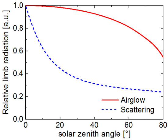 The relative limb radiation of both the airglow emission and atmospheric scattering varying with the SZA for a tangent height at 40 km.