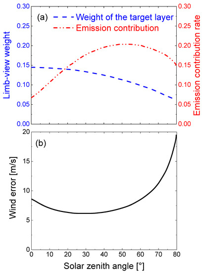 (a) The limb-viewing weight, as well as the emission contribution rate as a function of the SZA for a tangent height at 40 km; (b) the wind error at different values of the SZA.