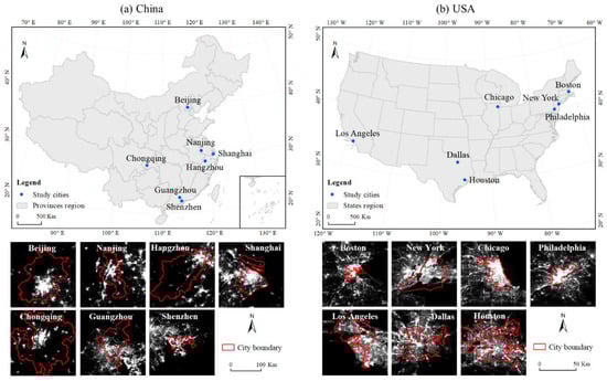 Daily Black Marble images (VNP46A1-A2) and annual Black Marble images (VNP46A4) are available at NASA website (https://blackmarble.gsfc.nasa.gov/ (accessed on 11 October 2022)). The seven city boundaries in China are provided by China Resource and Environment Science and Data Center (https://www.resdc.cn (accessed on 11 October 2022)). The seven city boundaries in the United States are from the official websites of each city (Boston, https://data.boston.gov/dataset/city-of-boston-boundary (accessed on 11 October 2022); New York, http://gis.ny.gov/gisdata/inventories/details.cfm?DSID=927 (accessed on 11 October 2022); Chicago, https://data.cityofchicago.org/Facilities-Geographic-Boundaries/Boundaries-City/ewy2-6yfk (accessed on 11 October 2022); Philadelphia, https://www.opendataphilly.org/dataset/city-limits (accessed on 11 October 2022); Los Angeles, https://geohub.lacity.org/datasets/lahub::city-boundary/explore?location=34.019779%2C-118.412043%2C10.53 (accessed on 11 October 2022); Dallas, https://www.dallasopendata.com/Services/FY-2017-City-of-Dallas-City-Limits/ad4m-4kje (accessed on 11 October 2022); Houston, https://mycity.houstontx.gov/houstonmapviewer/ (accessed on 11 October 2022)).