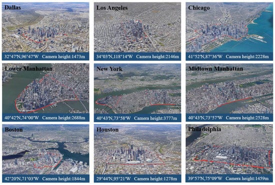 The auxiliary data includes city boundary and reference CBDs boundary data. The city boundary data were used to clip the study area, and the city CBD boundary data were used as validation data. All CBDs are the primary CBDs of each city. Firstly, regarding the city boundary, the seven city boundaries in China are from the Resource and Environment Science and Data Center (https://www.resdc.cn/), and the seven city boundaries in the United States are from the official websites of each city. Secondly, there are some differences in the collection of urban reference CBD boundaries between China and the United States. Since the construction of urban CBD in the United States is dominated by the market economy, while the construction of urban CBD in China is dominated by the government’s planning [], that is to say, the reference CBD boundaries in China [,] can be determined based on planning documents or other official documents (Table 2). To get reliable reference CBD boundaries for the United States, we manually delineated CBDs from Google 3D maps based on the CBD characteristics [,,]: (1) the concentration of commercial high-rise buildings; (2) enclosed by roads or riverside; (3) a clearly distinctive boundary from low buildings; (4) the urban downtown. The results of the delimitation are shown in Figure 2. It should be noted that many studies treated the area south of Manhattan’s Center Garden in New York as a large CBD, but it is known from the New York Google 3D images that the building height in the area south of Center Garden shows a high-low-high phenomenon []. Combining the most apparent characteristics of CBD (i.e., the concentration of high-rise density) and the special planning of New York City for Midtown Manhattan and Lower Manhattan (https://zr.planning.nyc.gov/), this paper here divides the area south of Center Garden into two important CBD areas in New York, namely Midtown Manhattan and Lower Manhattan.