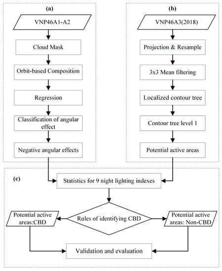 Based on NTL intensity and angular effects, we proposed a new method for CBD identification and delimitation in the study area. The workflow consists of the following steps: (a) angular effect quantification and classification; (b) using localized contour tree algorithm to acquire urban potential active area; (c) designing the rules for identifying CBD and evaluation (Figure 3).