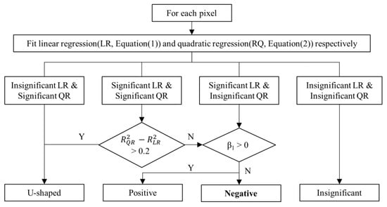 Three main steps were performed to get the distribution of angular effects in each study city: cloud mask, orbit-based composition, regression, and classification. Firstly, the corrected NTL layers obtained from VNP46A2 need to be masked by cloud and quality tags. Only keep the High-quality in the Mandatory_Quality_Flag layers, keep High Cloud Mask Quality, Confident Clear, and No Snow in the QF_Cloud_Mask layers. Using these flags to perform a cloud mask that ensures the pixel-wise observations are valid. To get more valid observations, we selected two years of daily Black Marble products (2017–2018), in which the number of valid observations of Los Angeles in 2017–2018 was so low that cannot support the next regression works. Combined with the development of the urban CBD in Los Angeles in the 1990s [], we assumed that the CBD landscape has remained unchanged. Therefore, in Los Angeles, we selected daily VNP46A1 and VNP46A2 in 2014, which is reasonable and provides a certain number of valid observations to fit the next equation. Secondly, according to the orbit law of the NPP-VIIRS satellite, the orbit of the NPP satellite visiting a fixed location on a given day will always be the same as its orbit 16 days ago. Therefore, the cloud-masked daily images were divided into 16 groups according to the orbits, and each group was composed by median to eliminate the effects of thin clouds, background noise, or random errors []. Finally, for the quantification and classification of angular effects, we referred to Tan’s quantification approach and classification rules [], as shown in Figure 4. In addition, Tan fitted regression on an averaging window of 3 by 3 pixels, which is too large for detecting CBD. Based on the subject of this paper, the relationship between VZA and NTL was fitted on each pixel with Equations (1) and (2) at a significance p-level of 0.01, and the angular effects were classified into four categories: positive, U-shaped, negative, and insignificant. We only kept the negative angle effects in this paper.