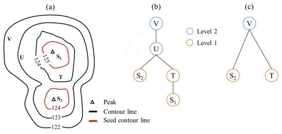 In previous studies of CBD delimitation, researchers depicted amounts of polygons on the map that concentrates many attributes of the CBD, whereby we also needed to depict a polygon that can represent the CBD on the NTL image. According to the previous study, there are strong artificial lights in CBD areas at night [], which means that the boundary of the CBD can be extracted based on the intensity of nighttime lights. Recently, Chen took the NTL as topographic data and considered the city center as the peak on the NTL topographic surface, finally using the local contour tree algorithm to get elemental urban centers that are significantly brighter than the surrounding areas []. The idea of this method is very consistent with the strong NTL intensity of CBD and is suitable for delineating the potential activity areas of CBD. Therefore, Chen’s algorithm would be adopted in this paper to obtain potential activity areas of CBD. The potential activity areas (PAAs) were derived from the annual Black Marble product VNP46A4 in 2018. Firstly, the annual NTL data were projected to the Albers Equal Area Conic projection and resampled to 500 m spatial resolution. Secondly, the image was mean filtered by a window of 3 × 3, which was done to reduce data noise. Thirdly, the contour interval was set to generate contour maps for NTL. Finally, a local contour tree algorithm was used to acquire PAAs. This algorithm includes three steps: finding a seed contour line, creating a regular localized contour tree, and simplifying the contour tree (Figure 5). In the first step, the closed seed contour is determined based on the local maximum, and the seed contours are all taken as level-1, such as and . In the second step, if the nearest contour line outside the seed contour contains only its seed contour, then this contour also belongs to level-1, for example, the nearest contour line outside the seed contour is contour T, and contour T contains only , so T also belongs to level-1. Conversely, if the nearest contour outside the seed contour encloses two or more seed contours or separate branches, then the contour is Level-2, for instance, the nearest contour line outside the seed contour is contour U, if the contour U encloses and , then U is level-2. Similarly, the contour V outside U also encloses two seed contours and has the same spatial inclusion connection as U, so V is level-2. After such a local rule, all contour lines are marked out with the corresponding level and the regular contour tree is generated (Figure 5b). In the third step, we need to simplify the regular contour tree to show the level structure of the mounts. Take T- in Figure 5b, T and are both same levels and hanged on the same branch, branching relationships like this are reduced to a single node T with a large extent to represent this one branch. Similarly, the V node is chosen as the representation of the level-2 structure in the V-U branch (Figure 5c). Finally, in this paper, only the simplified level-1 areas were retained as the potential active area of CBD.