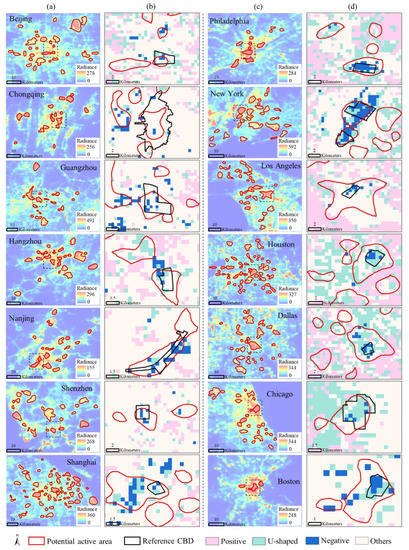 Based on annual Black Marble data, multiple PAAs were delineated using the localized contour tree method for each study city (Figure 6a,c). The total number of PAAs was 198 and 185 in Chan and the U.S., respectively. These urban PAAs contained different types of urban landscapes, such as CBDs, commercial districts, airports, and factories. In terms of angular effects, there were negative angular effects inside the CBD boundaries in all study cities, especially Philadelphia and New York, where there were several negative angle effect pixels (Figure 6b,d). In addition, there were also negative angular effects in non-CBD areas, such as Beijing, Chongqing, and Guangzhou in China, where there were also negative angular effects outside CBD areas. Overall, it is difficult to identify CBD by PAA or negative angular effects alone, and the information of both should be combined to identify the CBD of each city from multiple PAAs.